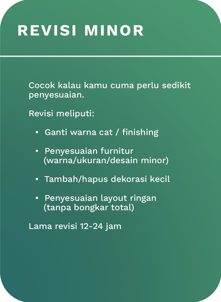 Ngerasa kurang cocok dengan desainnya? Ada detail yang mau diubah? Ajukan revisi sampai hasilnya sesuai ekspektasi kamu.